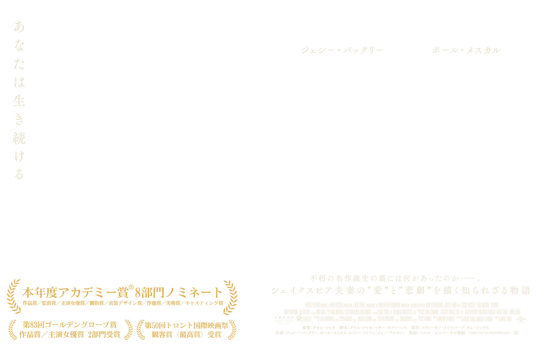 アグネス・シェイクスピアを演じるのは、『ウーマン・トーキング 私たちの選択』(23)のジェシー・バックリー、ウィリアム・シェイクスピアを演じるのは『グラディエーターII 英雄を呼ぶ声』(24)のポール・メスカル、その他、エミリー・ワトソン、ジョー・アルウィンなど実力派たちが脇を固め、製作には、スティーヴン・スピルバーグとサム・メンデスが名を連ねる。