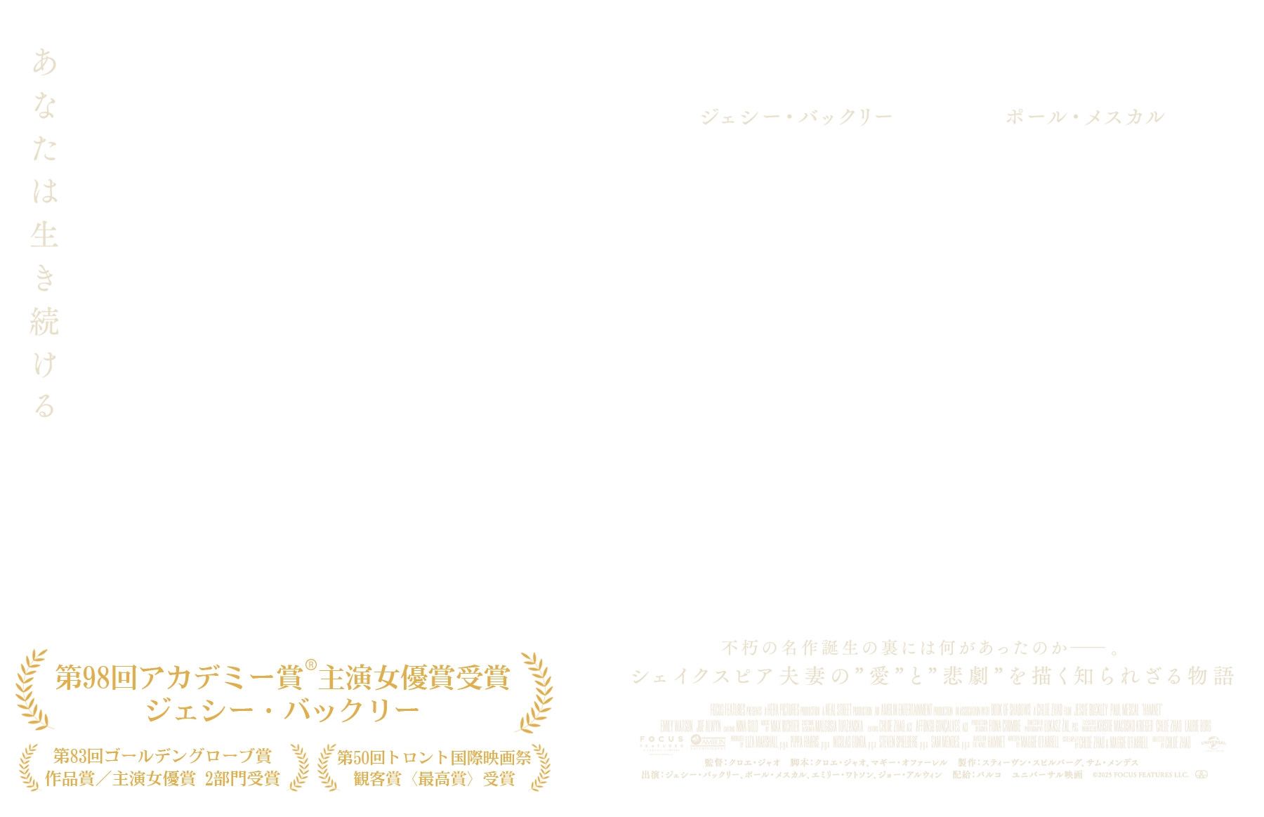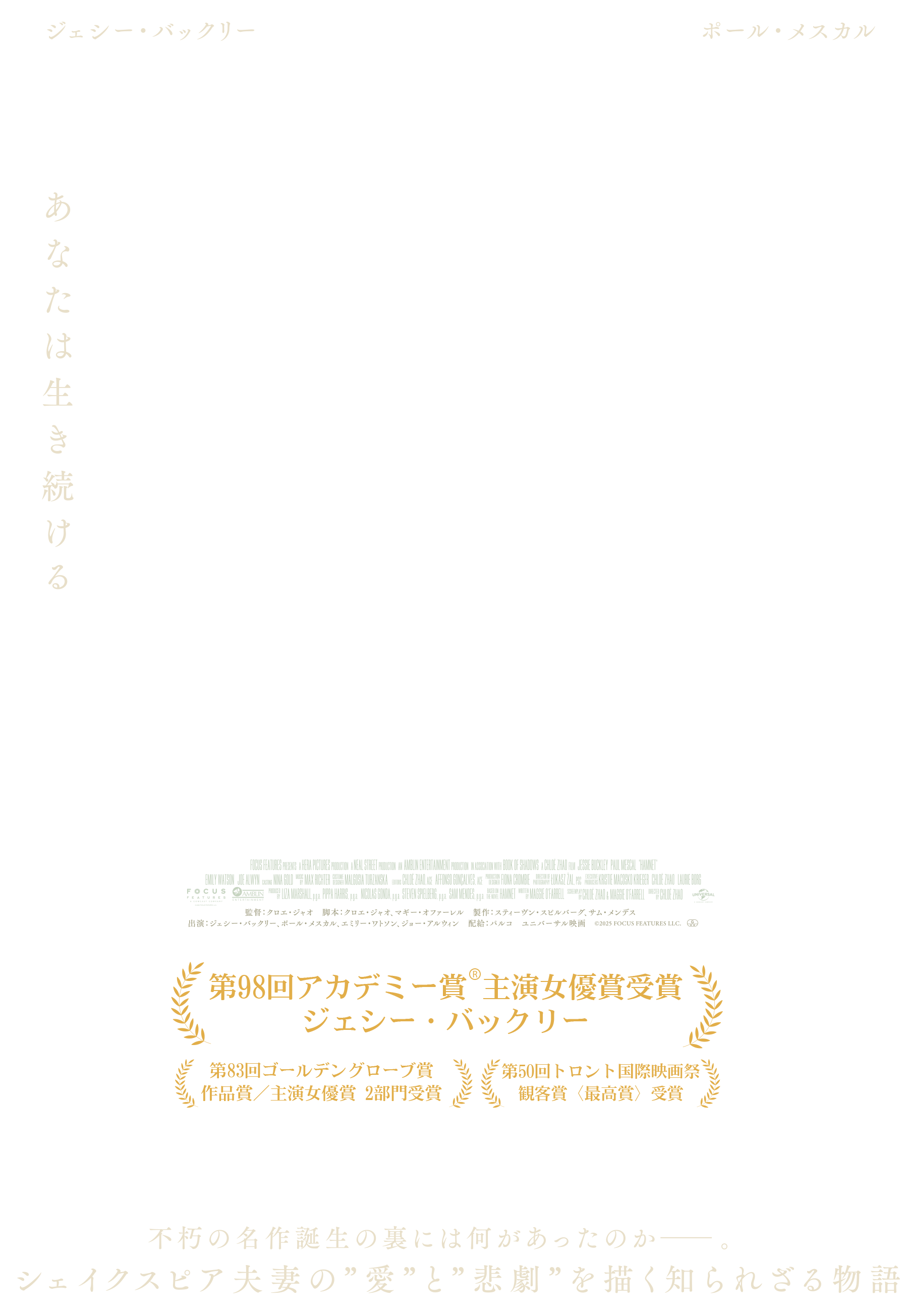 アグネス・シェイクスピアを演じるのは、『ウーマン・トーキング 私たちの選択』(23)のジェシー・バックリー、ウィリアム・シェイクスピアを演じるのは『グラディエーターII 英雄を呼ぶ声』(24)のポール・メスカル、その他、エミリー・ワトソン、ジョー・アルウィンなど実力派たちが脇を固め、製作には、スティーヴン・スピルバーグとサム・メンデスが名を連ねる。
